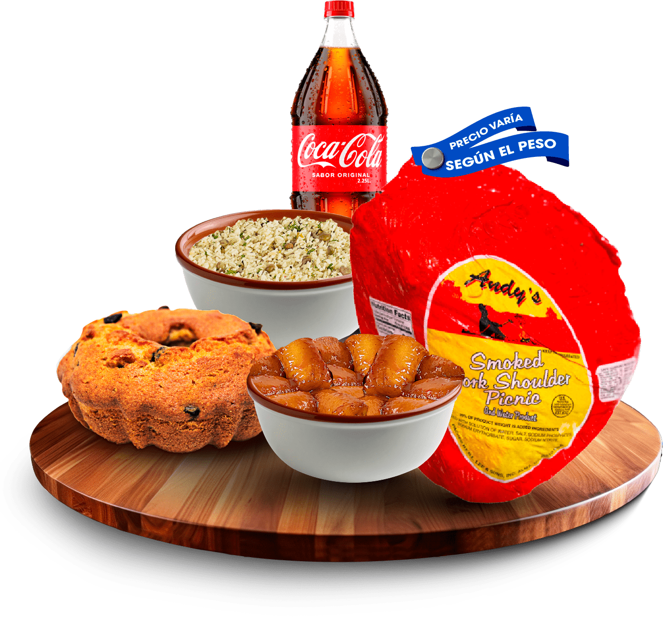 Jamón picnic, arroz con guandú o arroz con pollo, plátano en tentación, Rum Cake